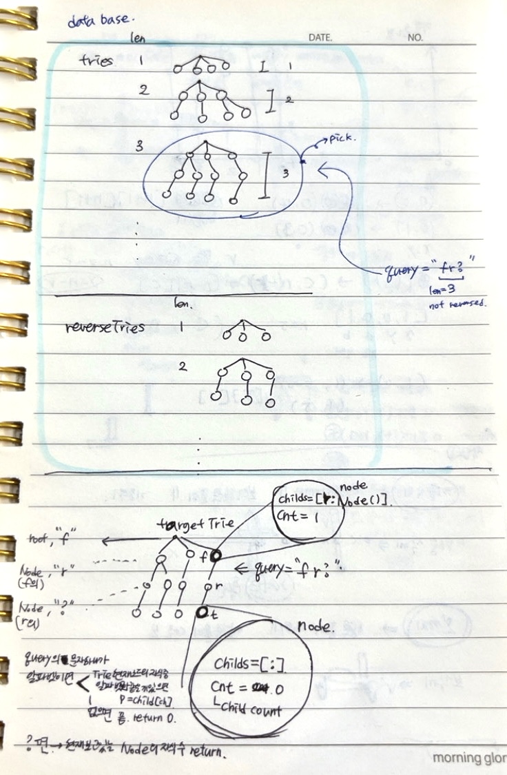 정확도와 효율성 테스트가 각각 있는 문제로 시간복잡도를 고려해야한다. 전체 가사 단어 길이의 합이 백만이고, 쿼리의 최대 개수 또한 10만개이기 때문에 쿼리 키워드 하나당 모든 가사 단어들을 검사하여 갯수를 반환하는 방법을 사용하면 시간초과로 효율성 테스트를 통과하지 못한다.