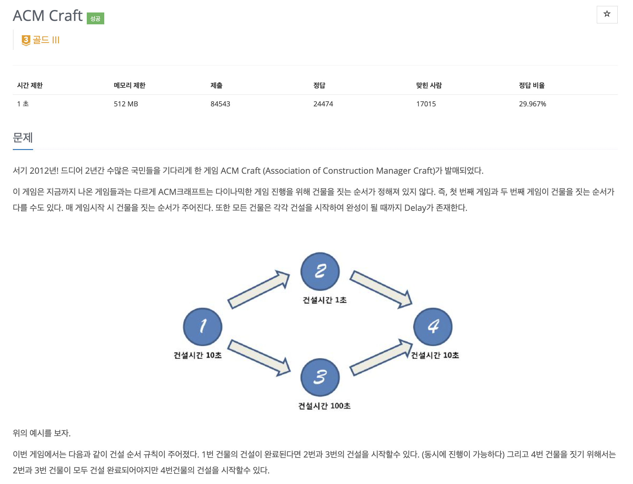 위의 사진의 경우 4번 건물을 2와 3이 모두 지어진 후인 110초 후에 지어지기 시작해서 120초가 걸려야 지어짐