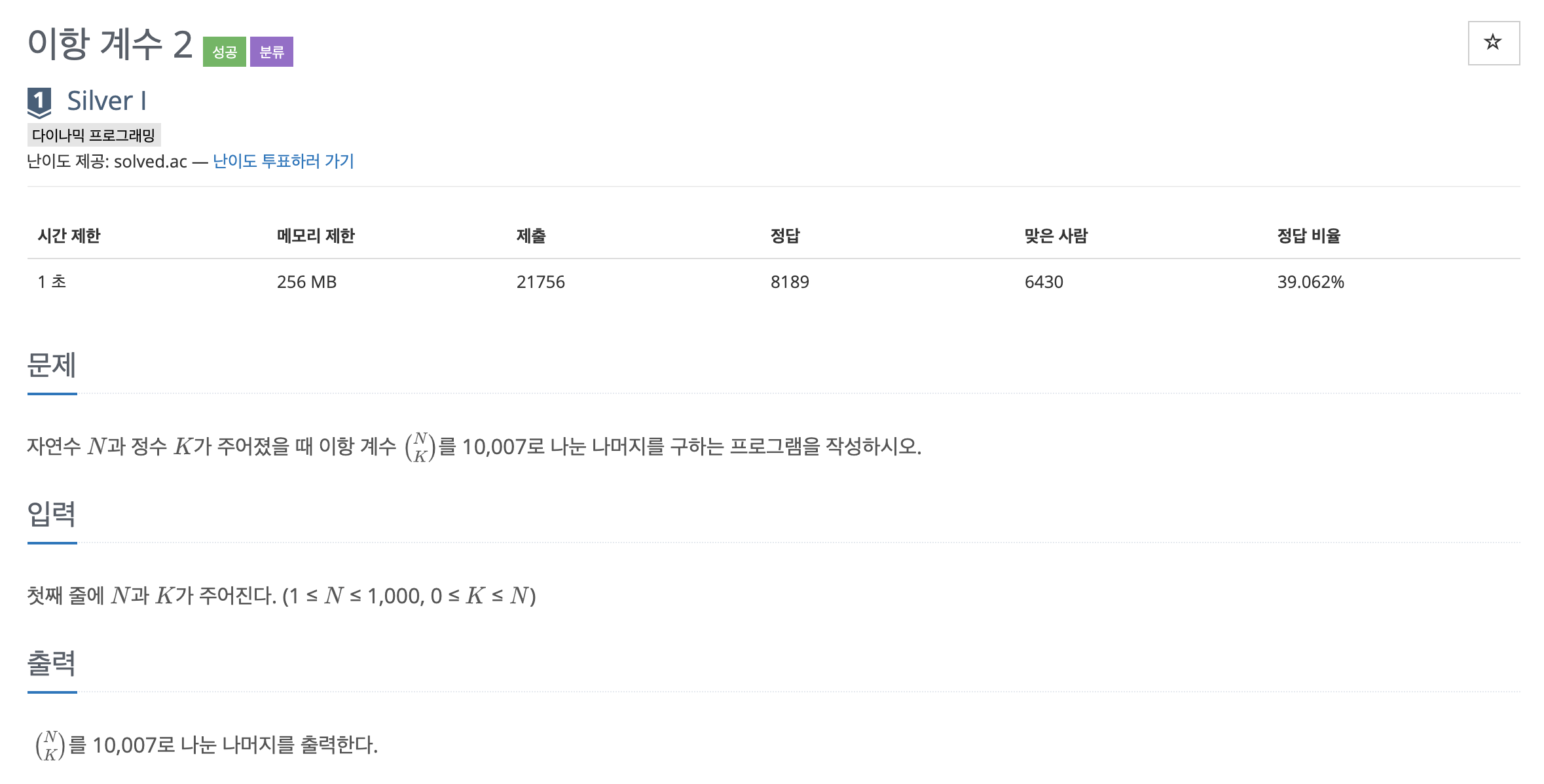 * 그냥 이항계수를 출력하는게 아니라 이항계수를 10007으로 나눈 값을 출력하는 것이기 때문에