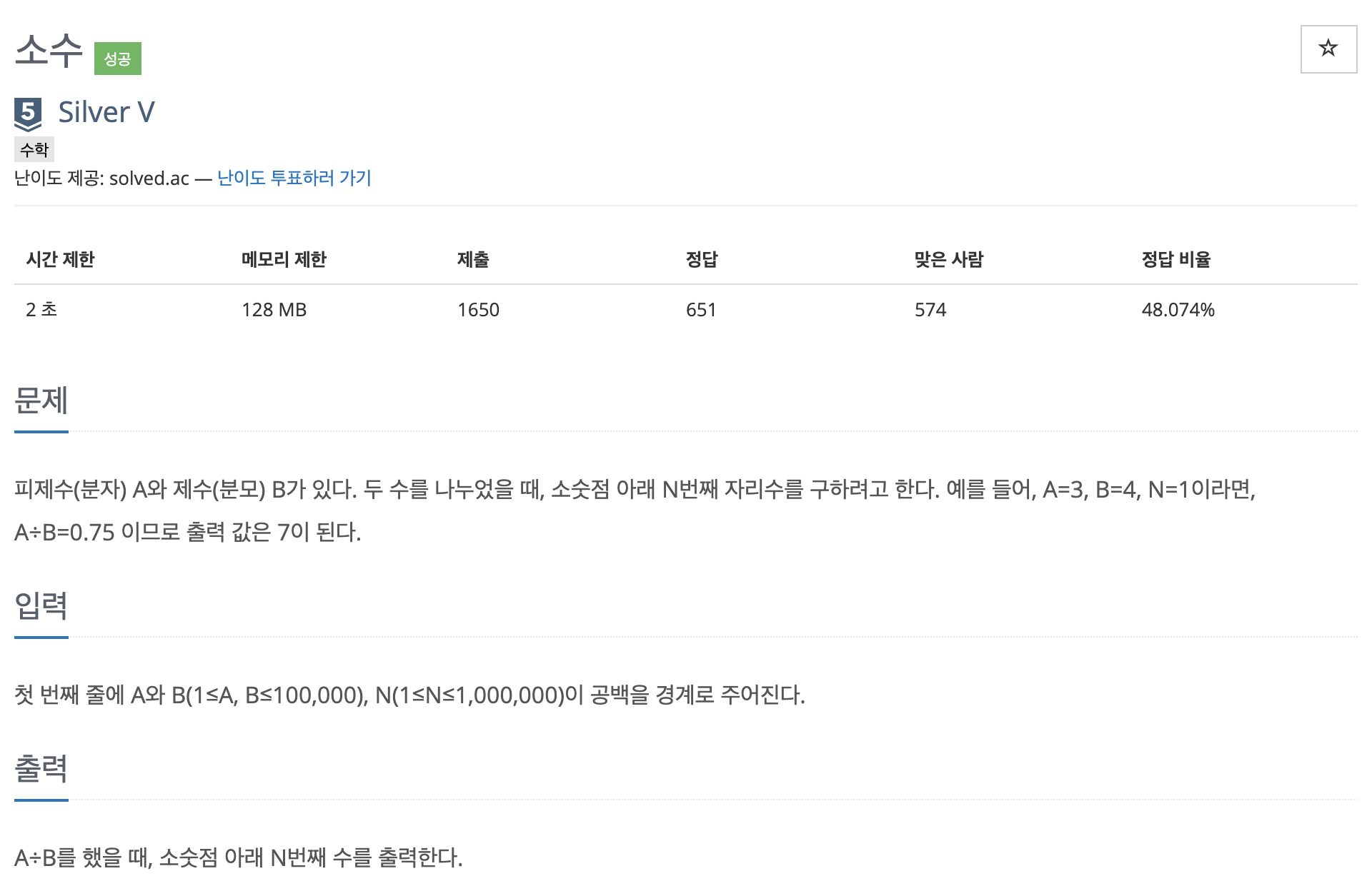 피제수(분자) A와 제수(분모) B가 있다. 두 수를 나누었을 때, 소숫점 아래 N번째 자리수를 구하려고 한다. 예를 들어, A=3, B=4, N=1이라면, A÷B=0.75 이므로 출력 값은 7이 된다.