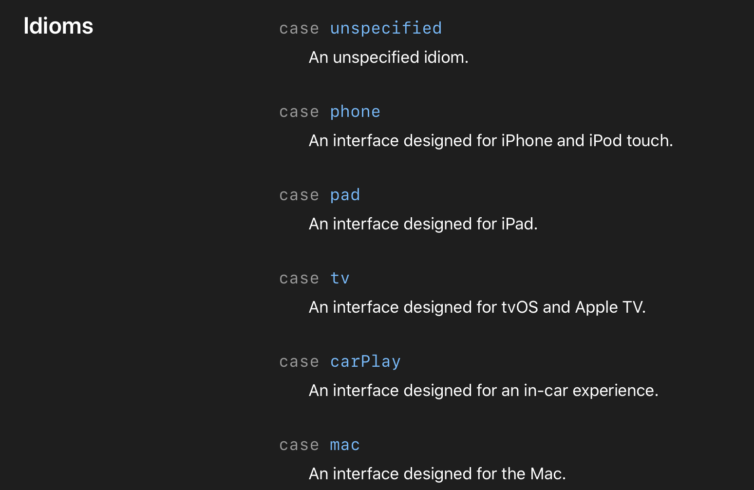 참고로 userInterfaceIdiom의 자료형은 UIUserInterfaceIdiom이라는 열거형 타입이고 종류는 unspecified, phone, pad, tv, carPlay, mac이 있다. idiom이 뭔지 모르겠어서 찾아보니 관용구,,라는데 여전히 모르겠음 뭐 그렇구나..