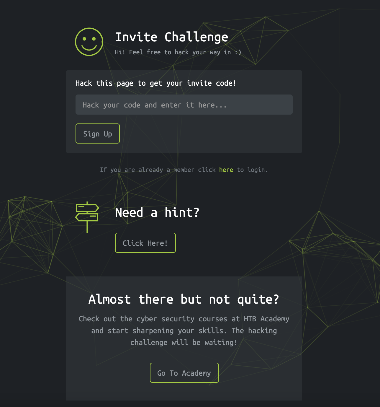eW91IGNhbiBzZWUgdGhhdCBwYWdlIHdoZW4geW91IGNsaWNrICdqb2luIG5vdycgYnV0dG9uLiB0aGUgaGludCB3YXMgbm90IGhlbHBmdWwgZm9yIG1lLiBmaXJzdCwgdXNlIHdlYiBicm93c2VyIGRldmVsb3BlciB0b29scyBhbmQgZ28gY29uc29sZSBzZWN0aW9uLiBJIGVudGVyZWQgIm1ha2VJbnZpdGVDb2RlKCkiIGl0IHdhcyBqdXN0IG15IGF0dGVtcHQuIHRoZW4geW91IGNhbiBzZWUgdGhlIGNvZGVzIG9mIHRoYXQgZnVuY3Rpb24uIHlvdSBjYW4gZ2V0IHNvbWUgJ2RhdGEnIGVuY3J5cHRlZC4gYW5kIGFsc28gZW5jcnlwdGlvbiB0eXBlIG1heWJlIFJPVDEzLiBpIHRoaW5rLCBpdCBjYW4gYmUgZGlmZmVyZW50IGJ5IGNhc2UuIHNvIG5vdyBkZWNvZGUgdGhlIGRhdGEgd2l0aCBlbmNyeXB0aW9uIHR5cGUuIHRoZW4geW91IGNhbiBnZXQgdGhlIG90aGVyIGhpbnQgaG93IHRvIGdldCBpbnZpdGUgY29kZS4gSSB1c2VkICdjdXJsJyBjb21tYW5kIHRvIG1ha2UgcG9zdCByZXF1ZXN0IC0+IGN1cmwgLVggUE9TVCB1cmx1cmx1cmwuIHRoZW4geW91IGNhbiBnZXQgc29tZSAnZW5jb2RlZCcgZGF0YS4gbm93IGlmIHlvdSBhY2Nlc3MgdGhlIHNpdGUgYWdhaW4gYW5kIGVudGVyICJtYWtlSW52aXRlQ29kZSgpIiBvbiBjb25zb2xlIGNvbW1hbmQgYWdhaW4sIG1heWJlIHlvdSBjYW4gZmluZCBvdXQgZGlmZmVyZW5jZXMuIHRoZSBlbmNvZGVkIGNvZGUgeW91IGdvdCBjYW4gYmUgZGVjb2RlZCBieSB0aGUgJ25ldycgZW5jcnlwdGlvbiB0eXBlLiBmaW5hbGx5IGl0IGlzIHlvdXIgaW52aXRlIGNvZGUgdG8gdGhlaGFja2JveC4geW91IGNhbiBqb2luIGluIHRoZSBoYWNrIGJveCAhIGNvbmdyYXR6BASE64