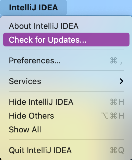 인텔리제이 실행 후 좌측 상단바의 인텔리제이 클릭 > Check for Updates 클릭 > Update 어쩌구 클릭