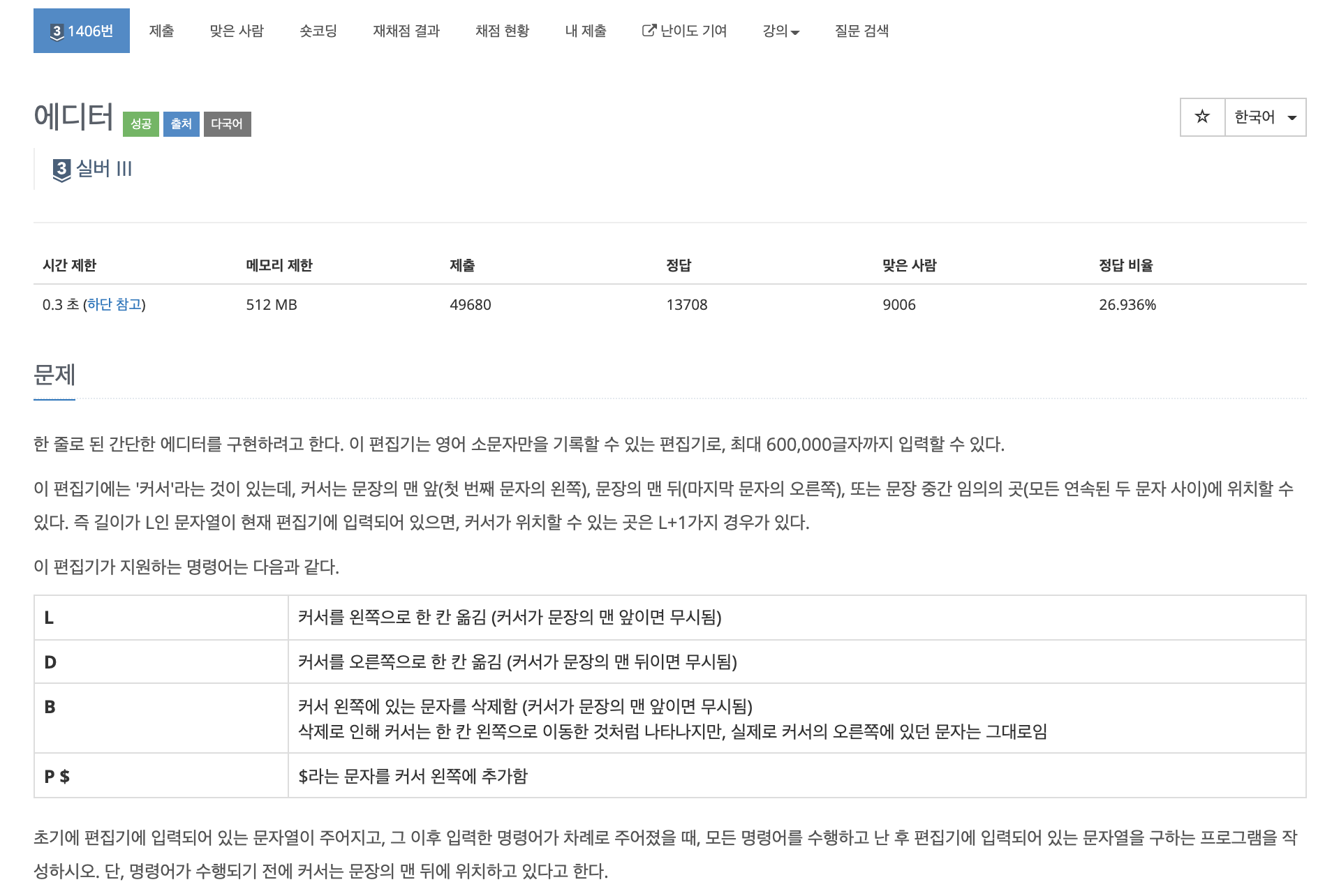 첫째 줄에는 초기에 편집기에 입력되어 있는 문자열이 주어진다. 이 문자열은 길이가 N이고, 영어 소문자로만 이루어져 있으며, 길이는 100,000을 넘지 않는다. 둘째 줄에는 입력할 명령어의 개수
