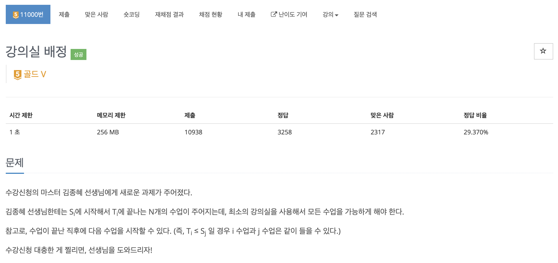 강의 시간표 (시작시간, 종료시간)이 주어지고 최소한의 강의실을 배정하여 강의실 개수를 출력하는 문제