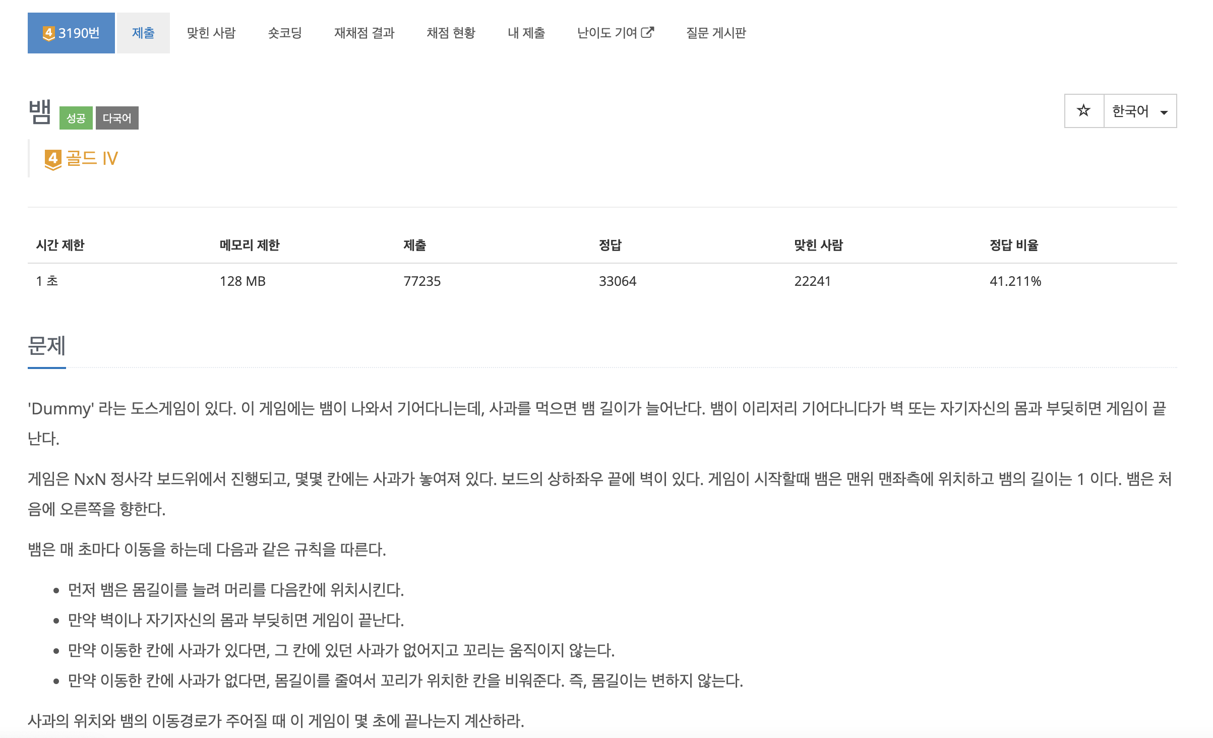 N * N 보드에서 길이 1짜리 뱀으로 시작해서 한칸씩 늘리면서 이동하면서