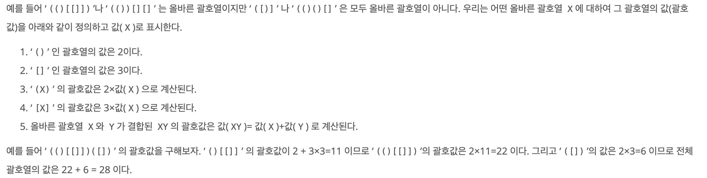 규칙은 (()[[]]) 이런 문자열이라면 2*(2+3*3) = 22 가 된다.