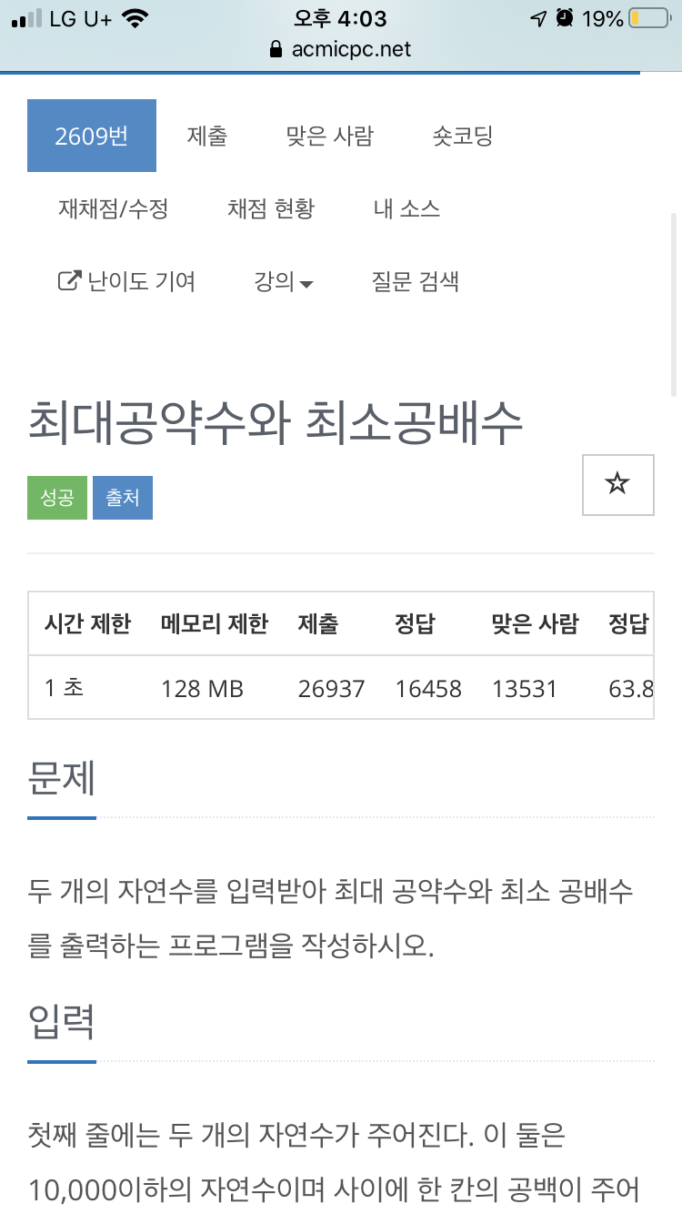 리터럴리 두 정수의 최대공약수랑 최소공배수를 출력하는 문제다.