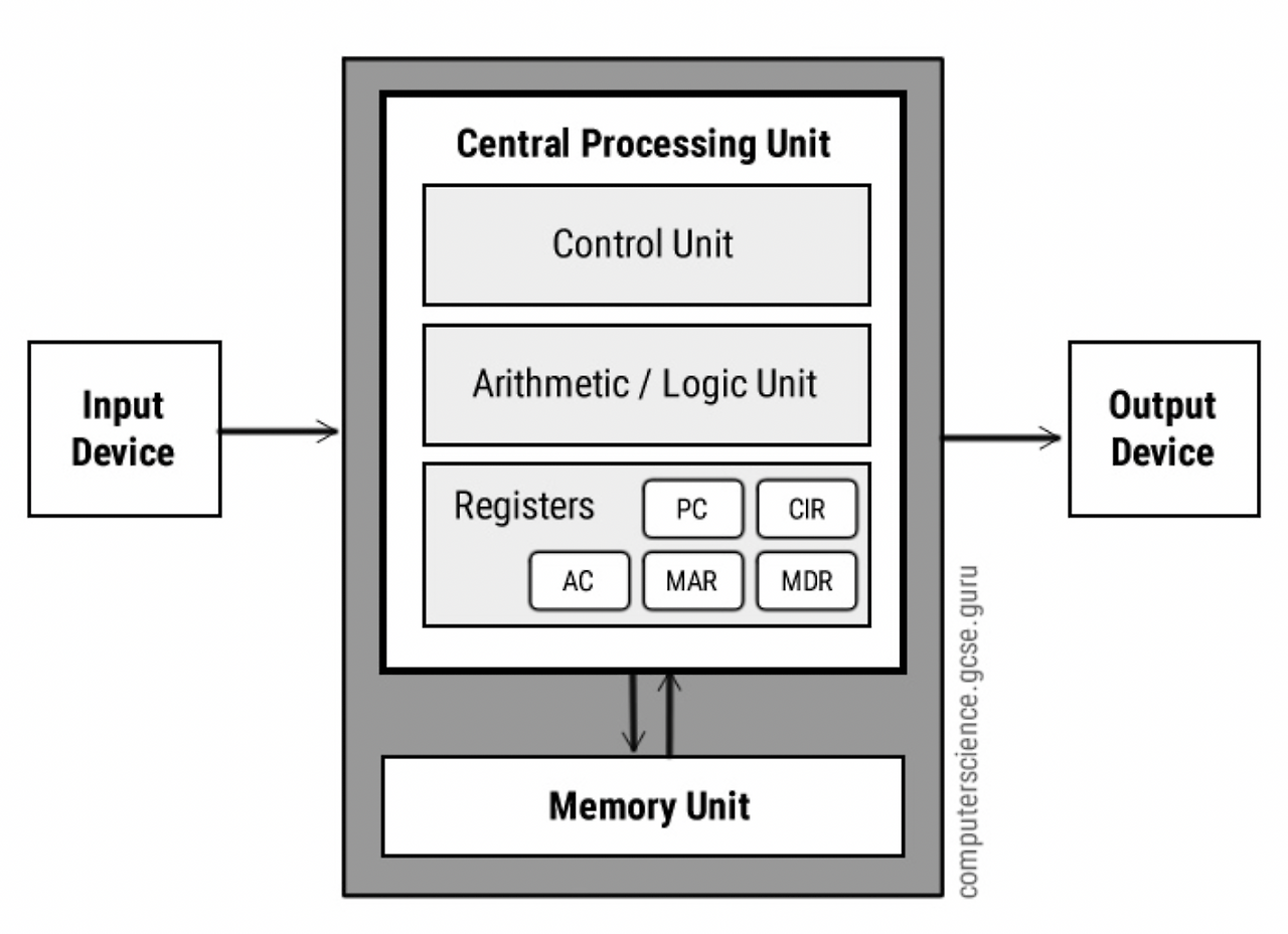CPU의 제어장치(CU)에 의해 메모리에 있는 계산할 값을 레지스터로 이동, ALU(산술논리연산장치)에서 레지스터에 있는 값을 처리(계산), 처리 후 레지스터에 저장된 처리값을 다시 메모리에 저장