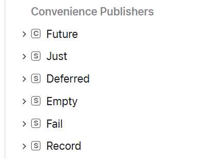 앞에서 Publisher는 인터페이스 즉 프로토콜이라고 했는데요, 애플에서 Publisher를 편하게 쓸 수 있도록 몇가지 구현체를 만들어 두었습니다. 는 아래와 같이 Future, Just, Deferred, Empty, Fail, Record 가 있고 이 외에도 직접 커스텀한 Publisher를 만들어서 사용할 수도 있습니다.