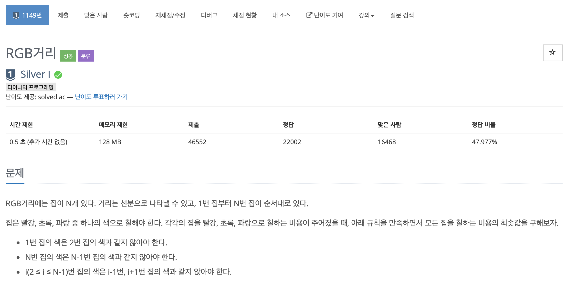 뭔가 부족한 부분이 있었다. 첫번째 까지의 최선을 저장하는 값이 하나가 아니라 한 집당 세개의 색을 칠했을 경우 모두를 고려해야 했다.