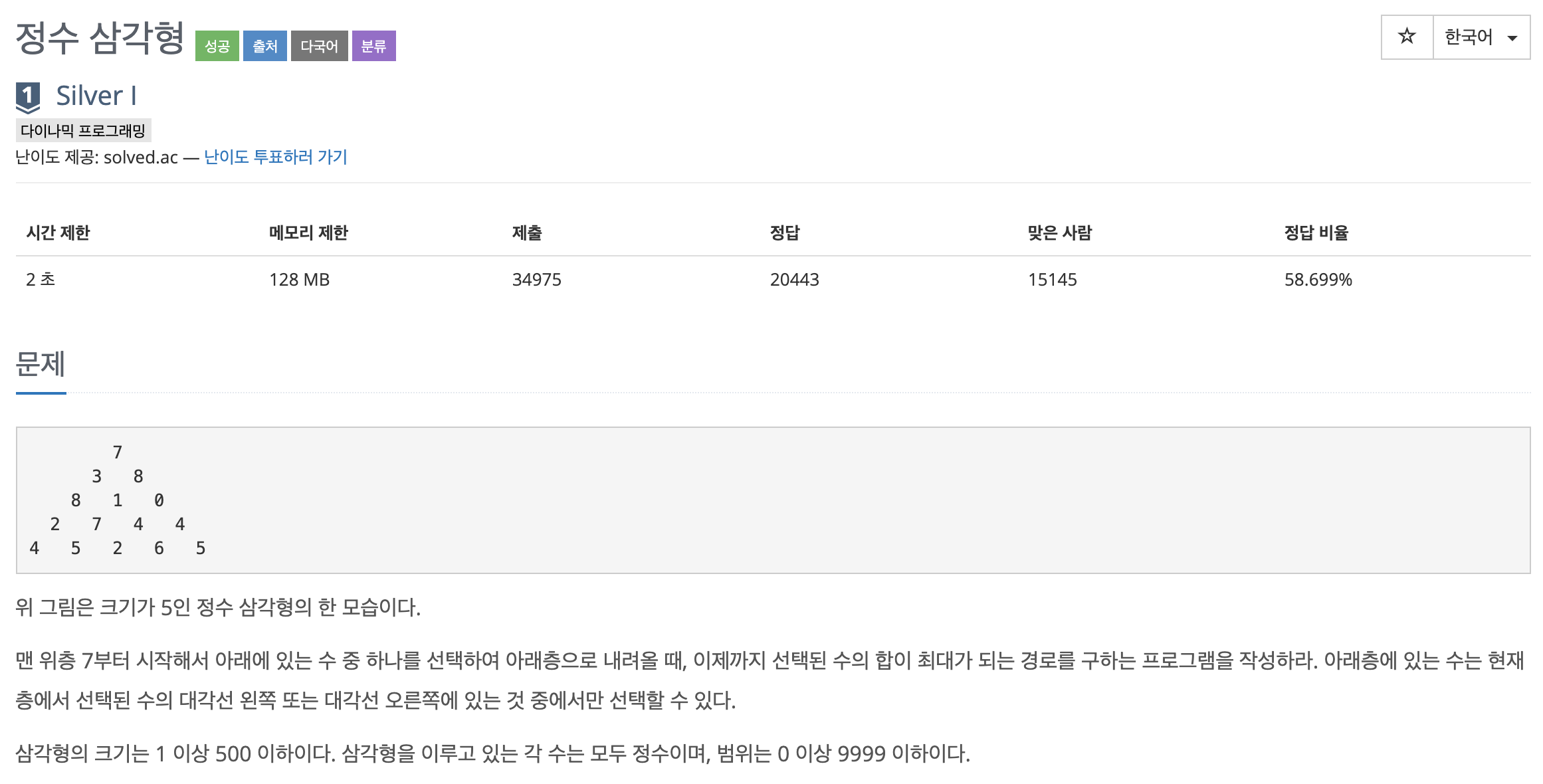 문제 7 3 8 8 1 0 2 7 4 4 4 5 2 6 5 위 그림은 크기가 5인 정수 삼각형의 한 모습이다. 맨 위층 7부터 시작해서 아래에 있는 수 중 하나를 선택하여 아래층으로 내려올 때, 이제까지 선택된 수의 합이 최�