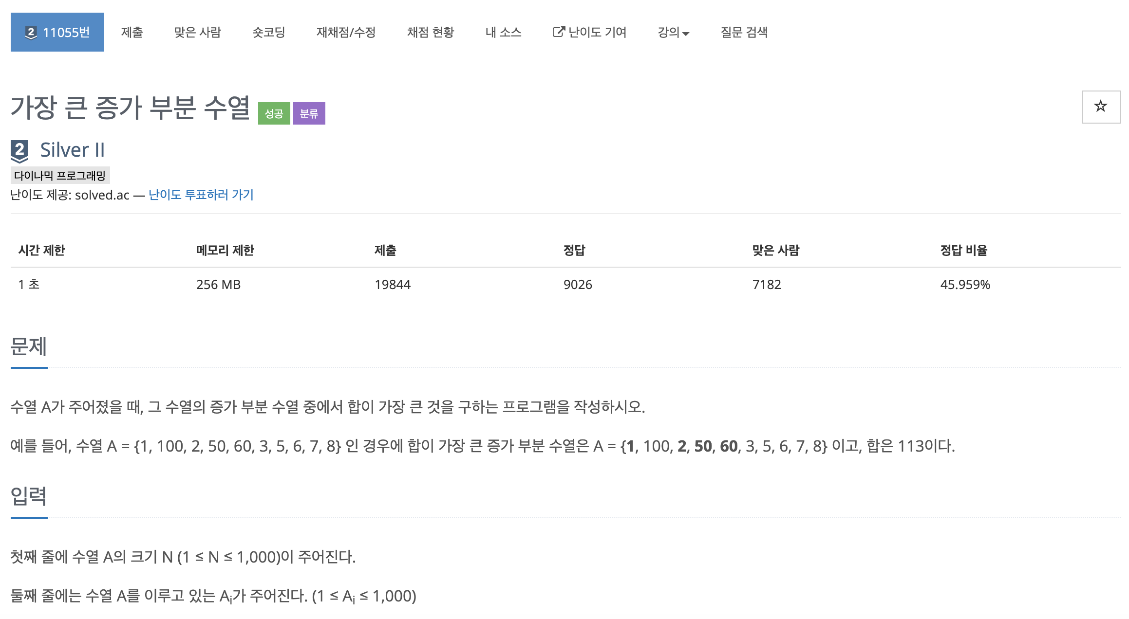 이번엔 가장 큰 증가하는 부분 수열의 합 구하기