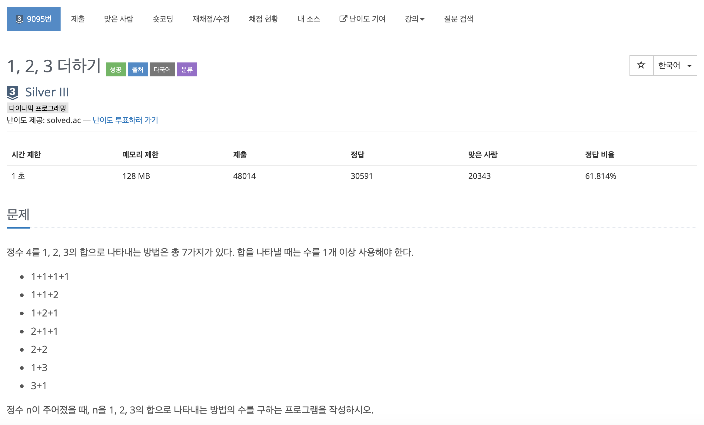 문제 정수 4를 1, 2, 3의 합으로 나타내는 방법은 총 7가지가 있다. 합을 나타낼 때는 수를 1개 이상 사용해야 한다. 1+1+1+1 1+1+2 1+2+1 2+1+1 2+2 1+3 3+1 정수 n이 주어졌을 때, n을 1, 2, 3의 합으로 나타내는