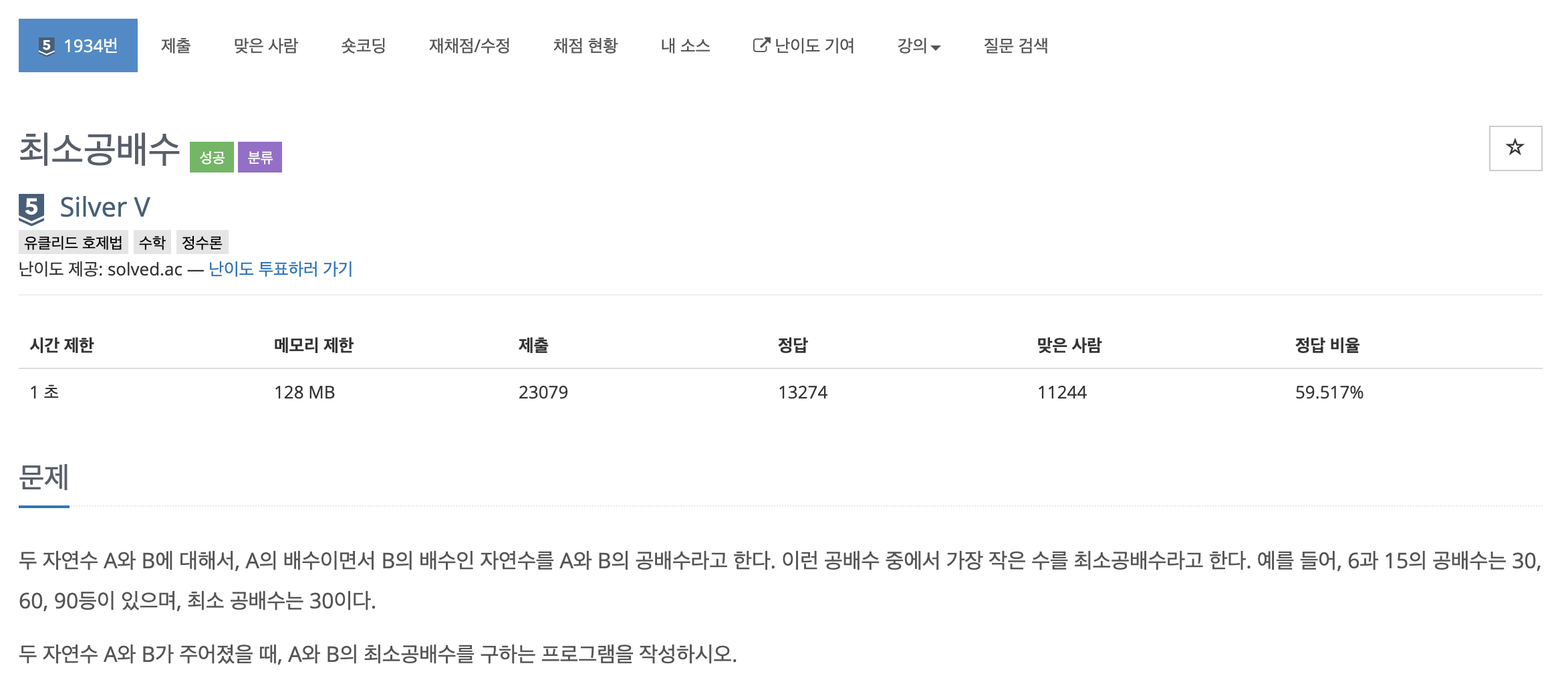 - 최소 공배수 = 두수의 곱 / 최대공약수