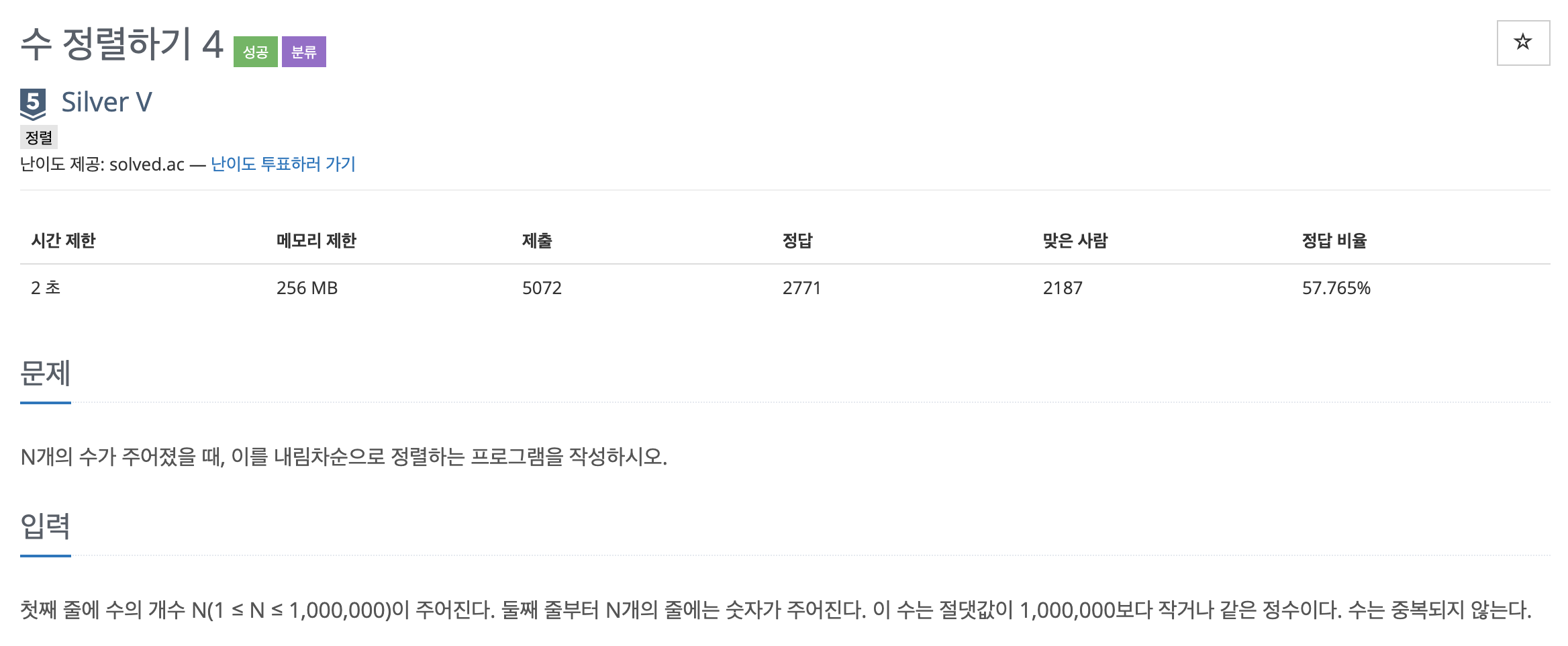 문제 랭크 실버 이상 풀어야해서 실버 5정도만 골라보다가 진짜 안되겠다 싶어서 정렬을 풀기로 했습니다..