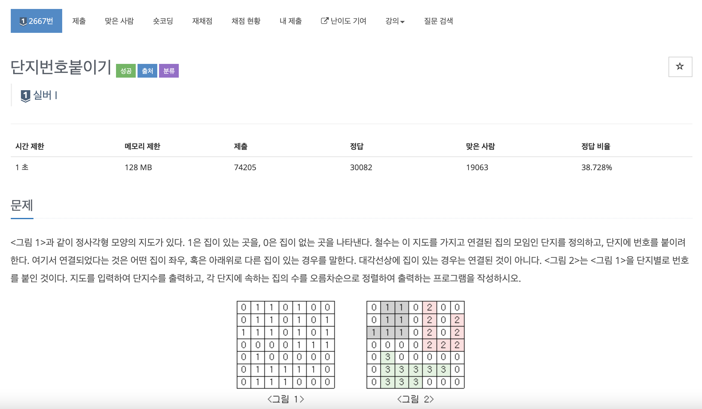 <그림 1>과 같이 정사각형 모양의 지도가 있다. 1은 집이 있는 곳을, 0은 집이 없는 곳을 나타낸다. 철수는 이 지도를 가지고 연결된 집의 모임인 단지를 정의하고, 단지에 번호를 붙이려 한다. 여