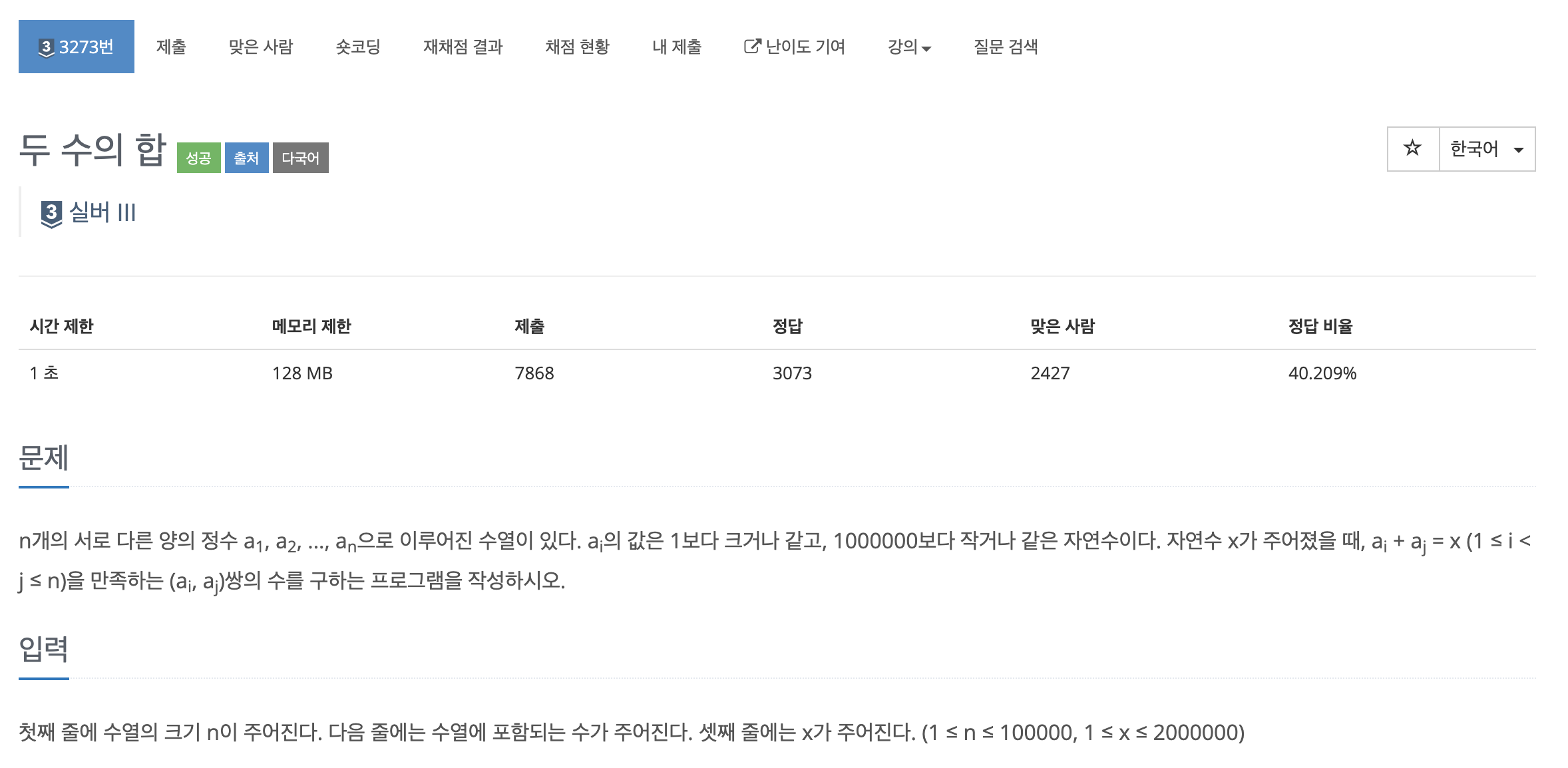 n개의 서로 다른 양의 정수 a1, a2, ..., an으로 이루어진 수열이 있다. ai의 값은 1보다 크거나 같고, 1000000보다 작거나 같은 자연수이다. 자연수 x가 주어졌을 때, ai + aj = x (1 ≤ i < j ≤ n)을 만족하는