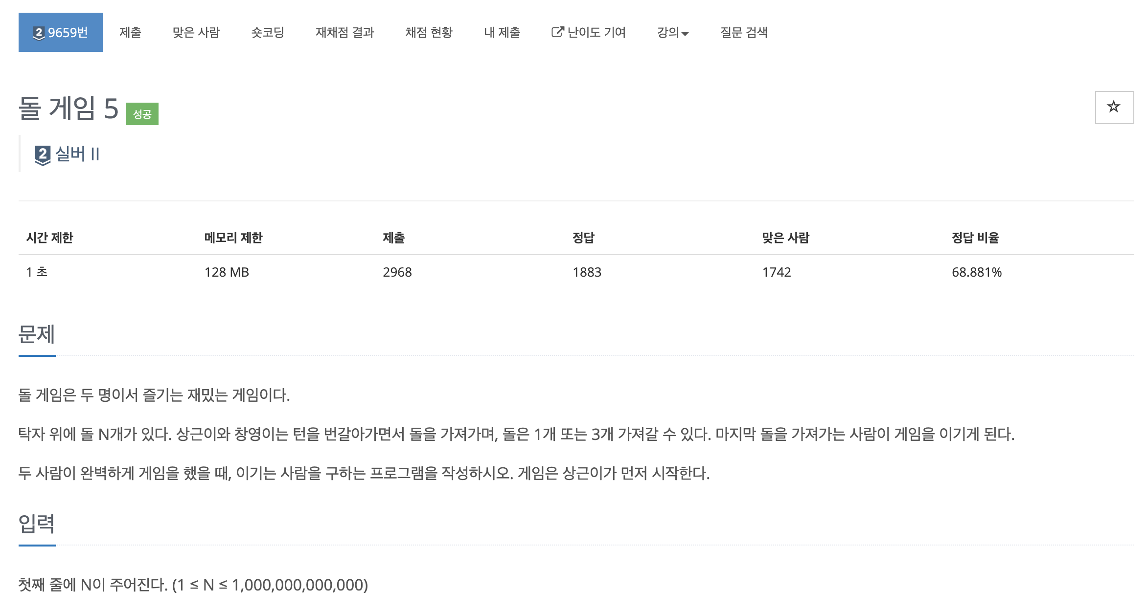 [백준 9659] 알고리즘 117일차 : 돌 게임 5