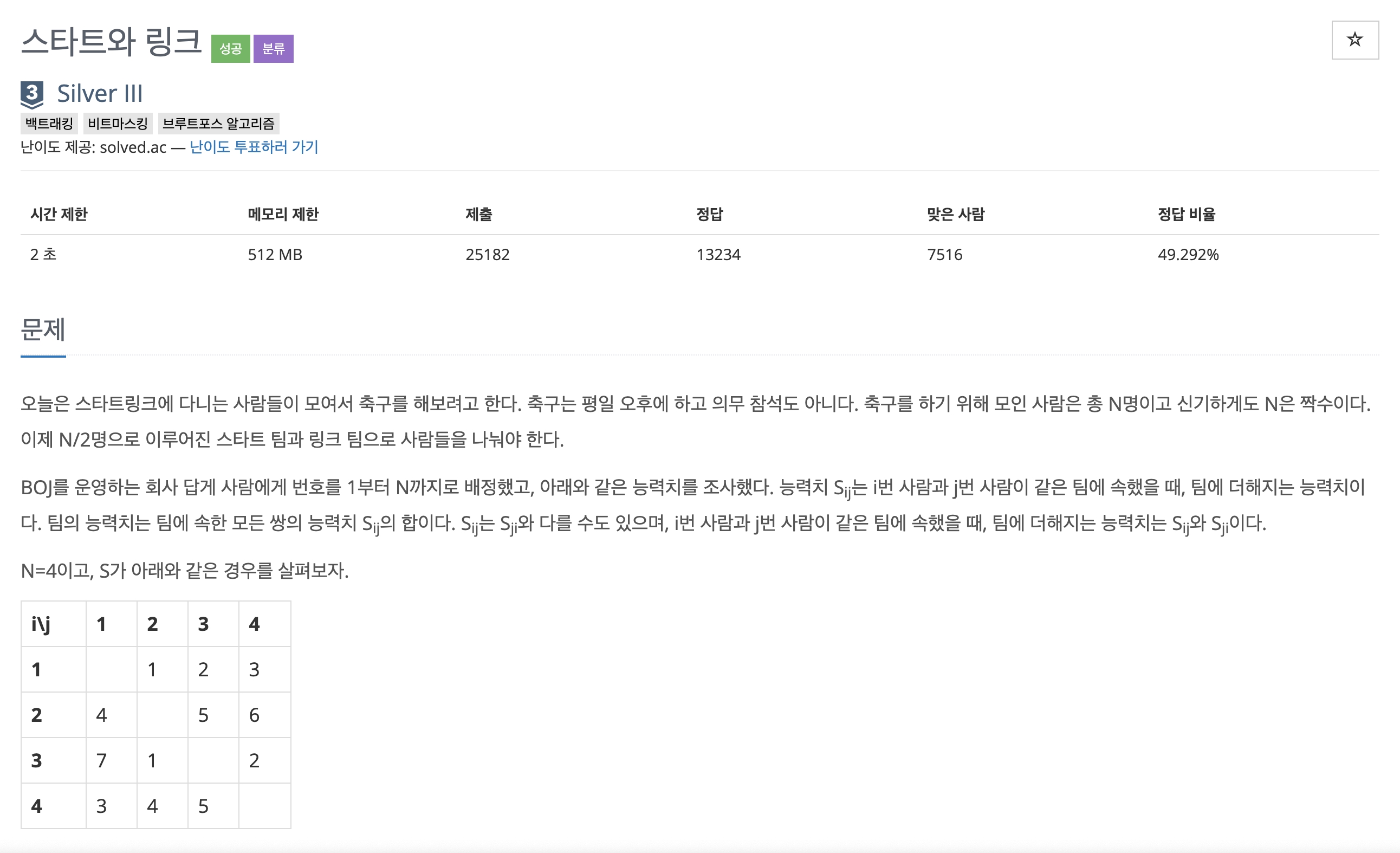 [백준 14889] 알고리즘 19일차 : 스타트와 링크
