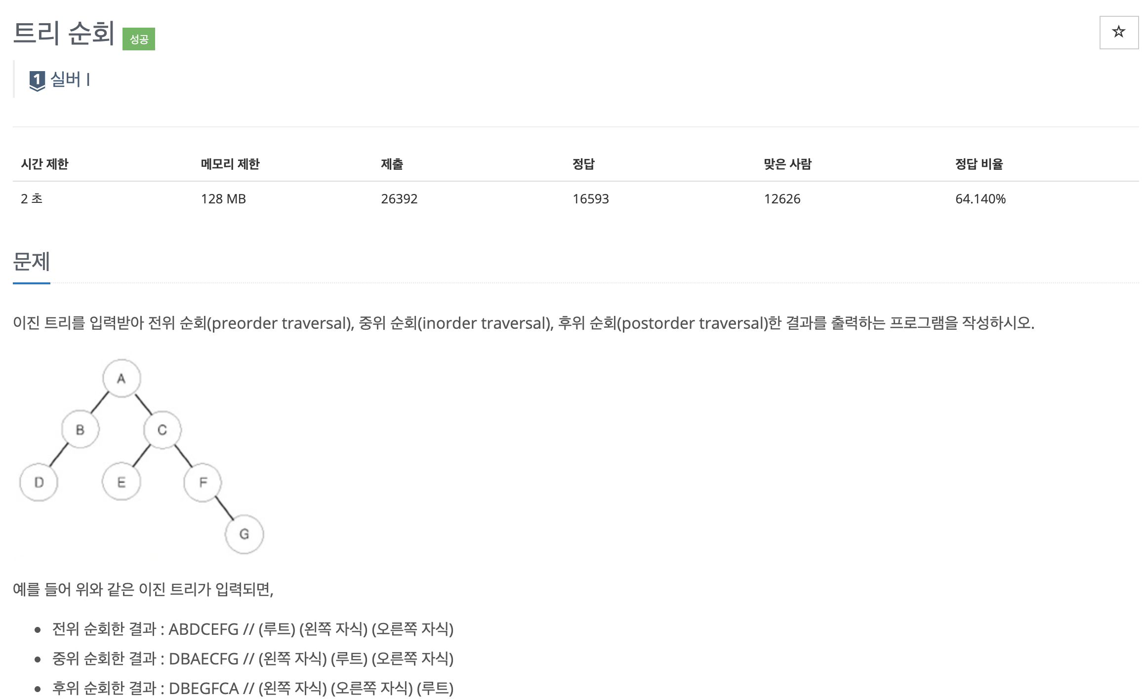 이 문제는 트리의 세가지 순회 방법 전위순회, 중위순회, 후위순회를 다룬 문제입니다.