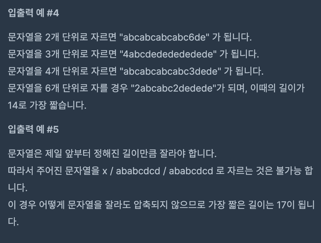 이를 맨앞에서부터 일정 단위만큼 잘라서 연속되며 + 중복되는 글자를 -> 연속적으로 중복되는 횟수 + 반복되는 문자열 로 압축할 수 있다고 할 때 가장 짧게 문자열을 압축할 수 있는 길이를 구하는 문제