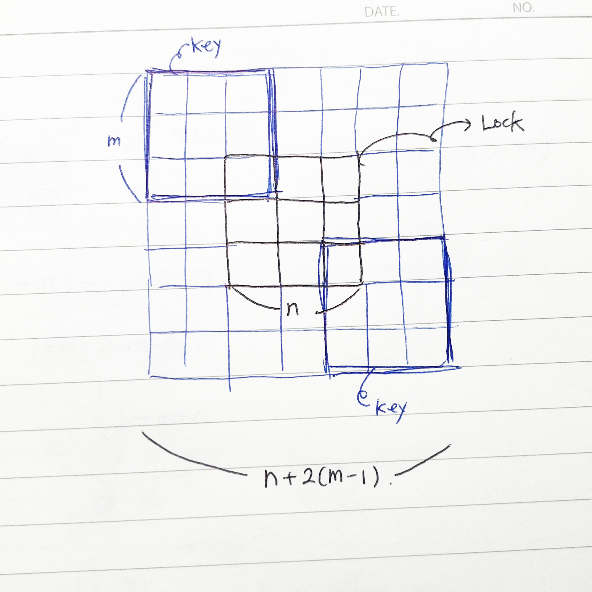 key를 90도씩 회전하고 이리저리 옮겨서 lock을 풀 수 있는지 물어보는 문제