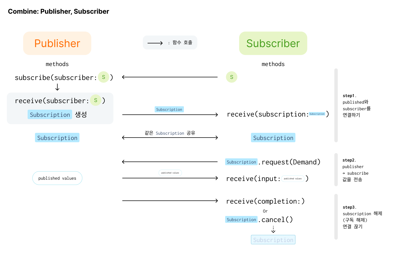 전에 Publisher에서 Publisher의 receive(subscribe:) method를 통해 Publisher와 Subscriber를 연결하고,
