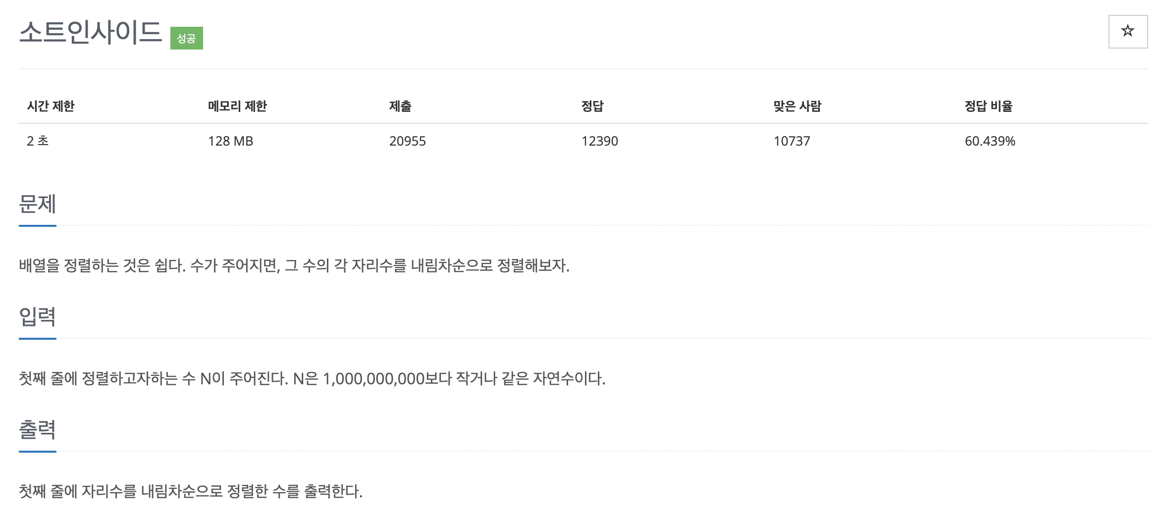 [백준 1427] 알고리즘 13일차 : 소트인사이드