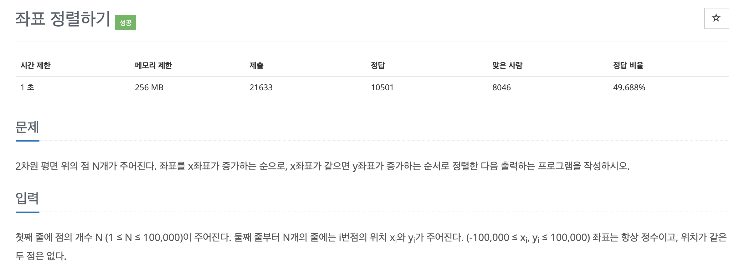 [백준 11650] 알고리즘 14일차 : 좌표 정렬하기