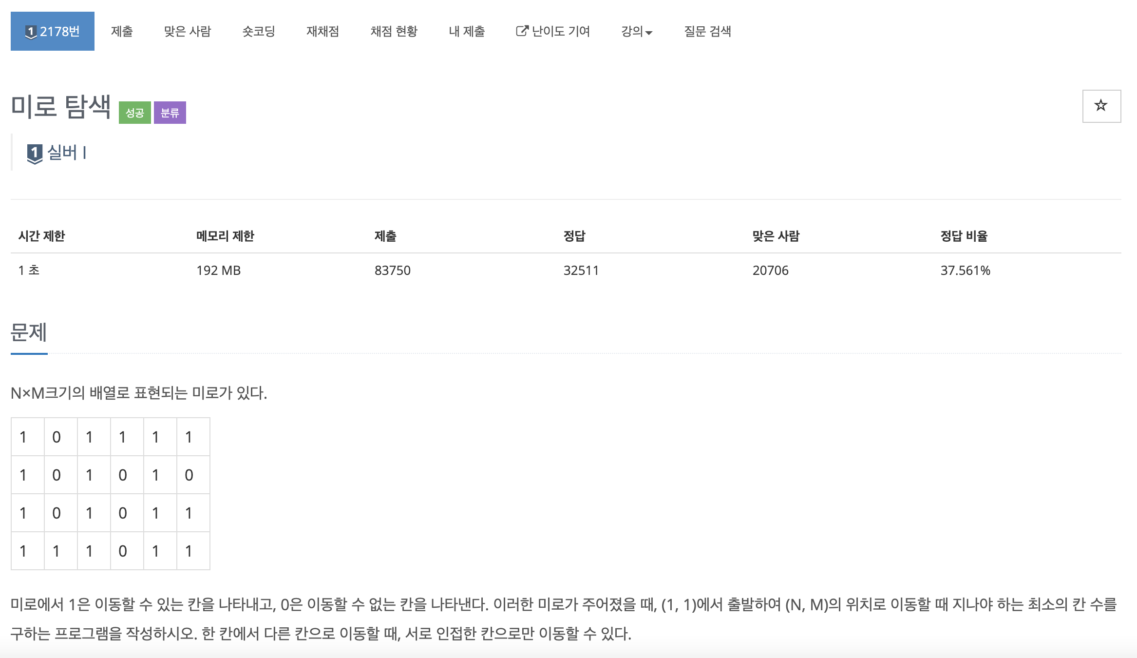 [백준 2178] 알고리즘 84일차 : 미로탐색